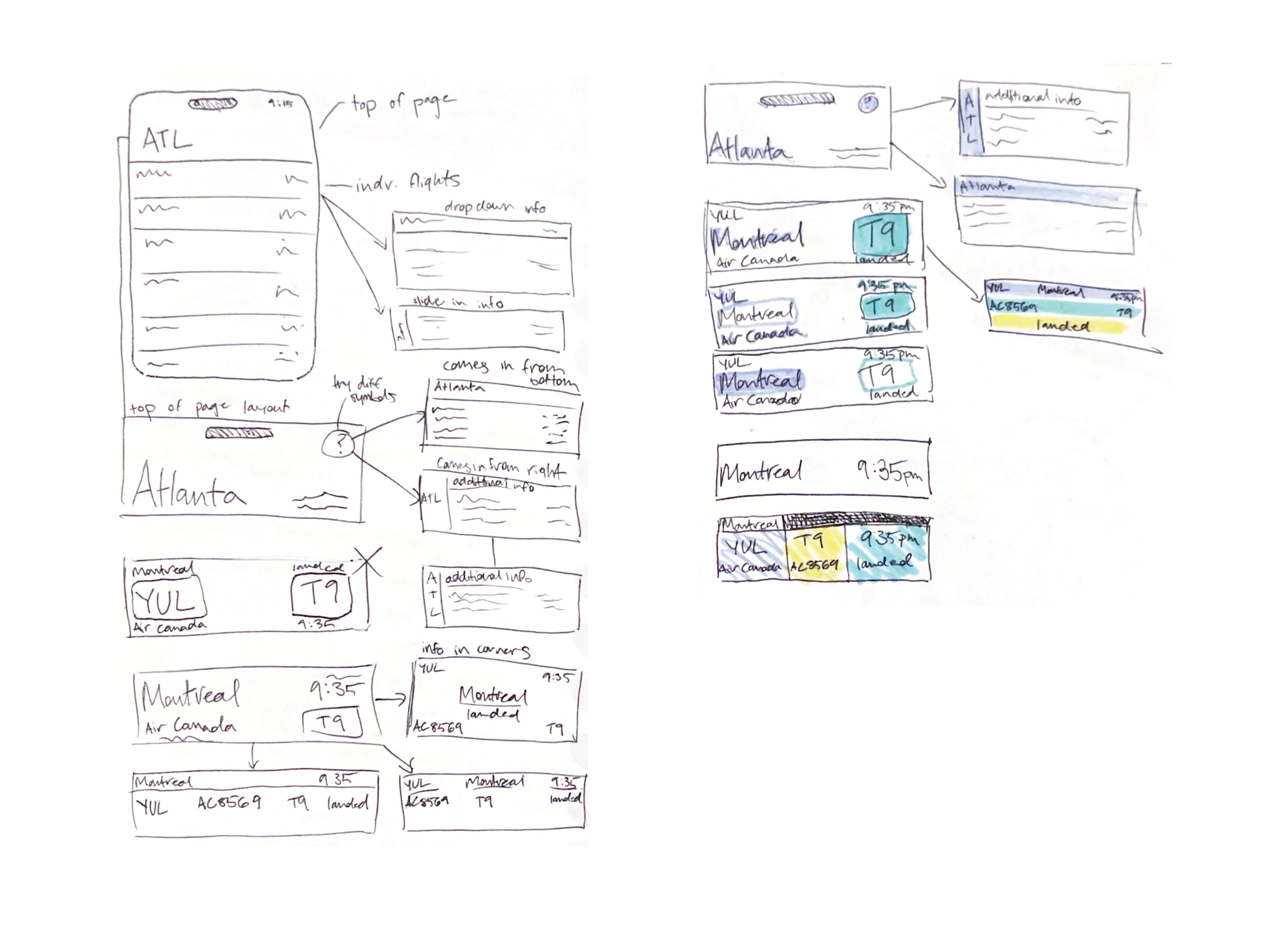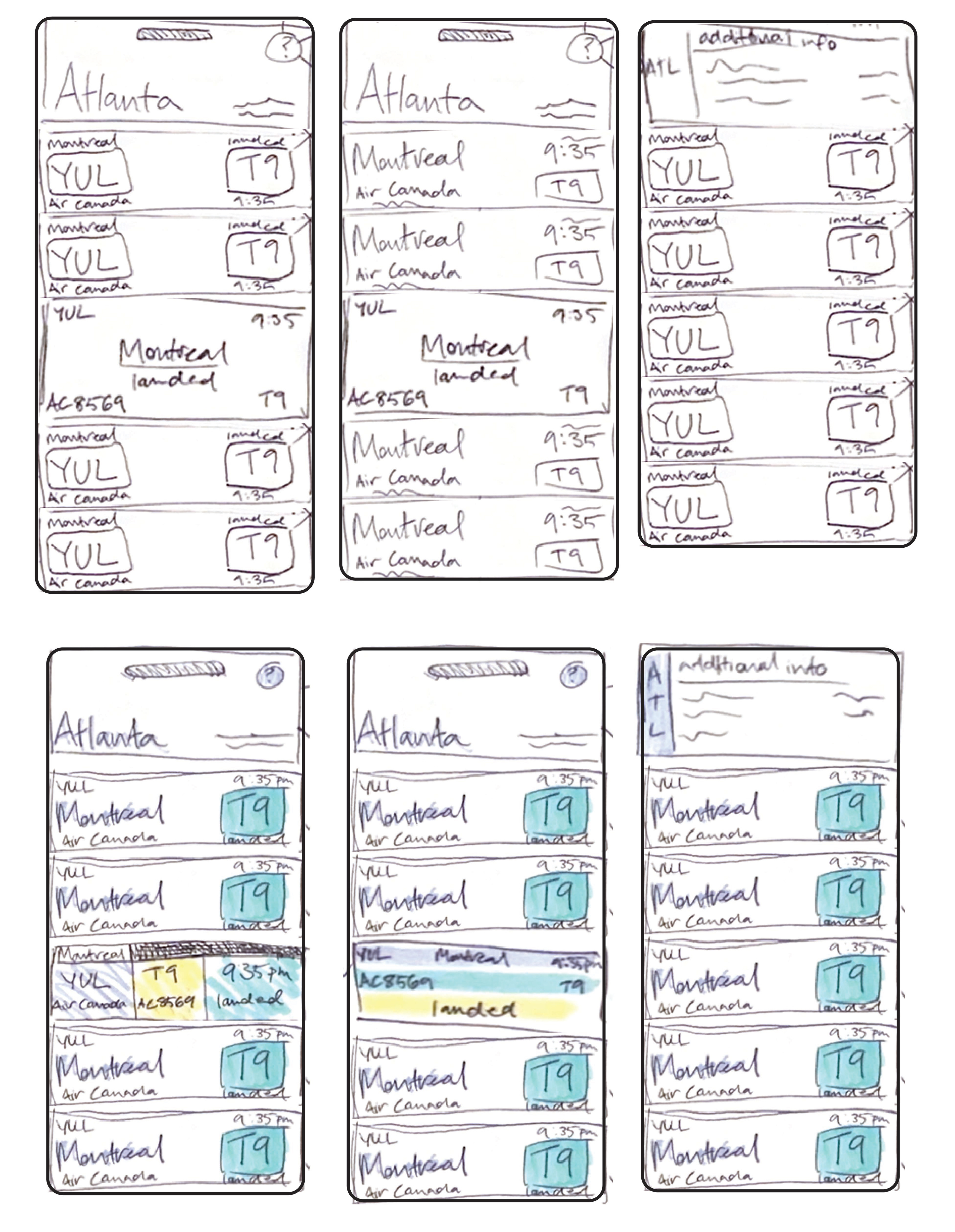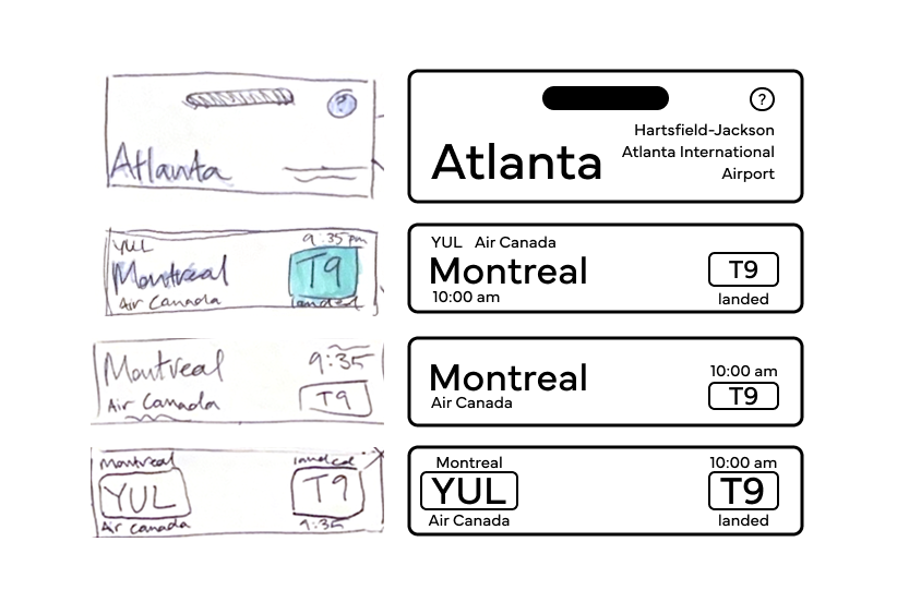 Following research and observation of airport navigation systems and signage, I conducted initial sketches and organized those sketched elements into screen layouts. These elements included the header (which displayed the name of the airport), initial menus (displaying broad info such as flight location, time, and gate number), and dropdown menus which display more specific info.
