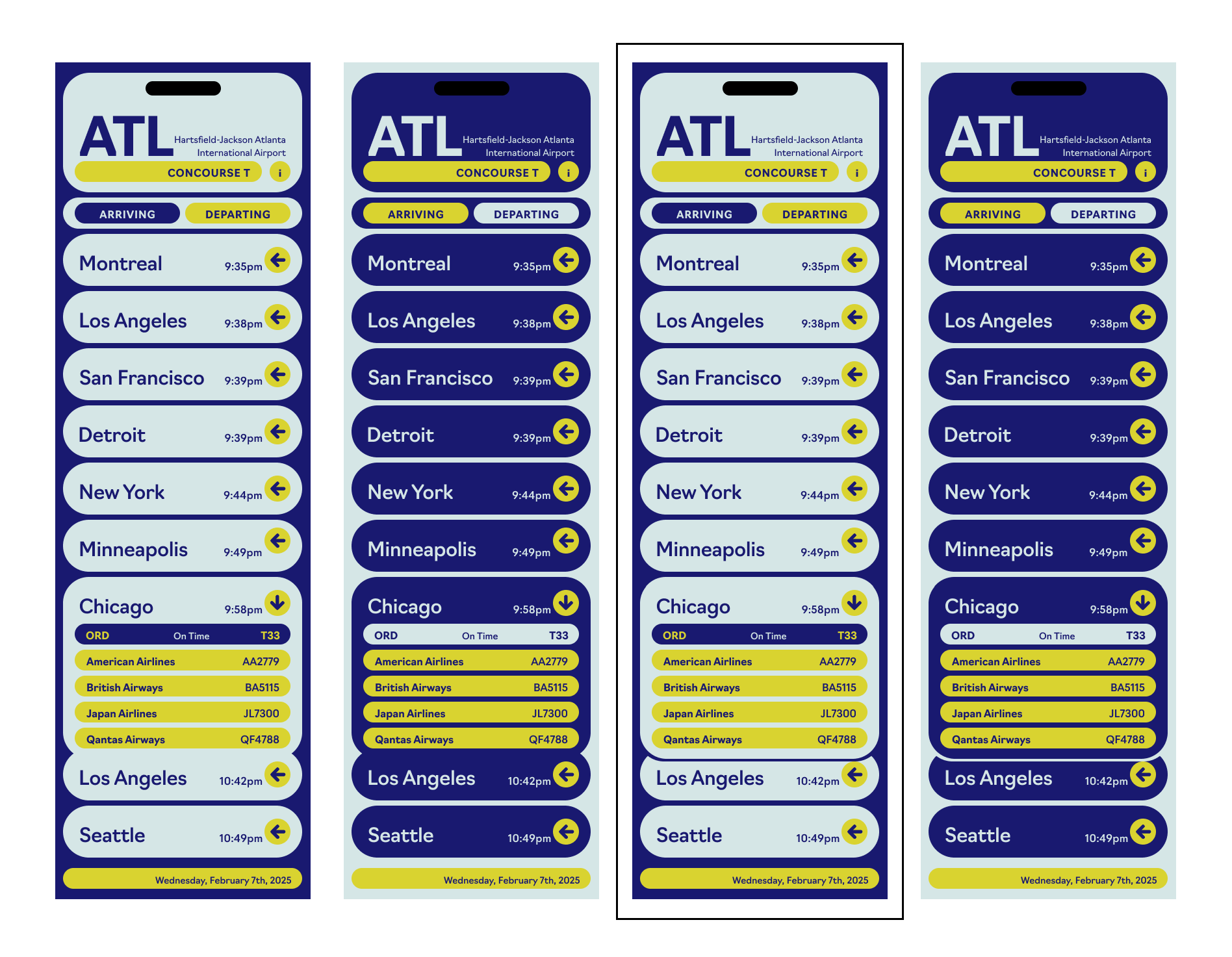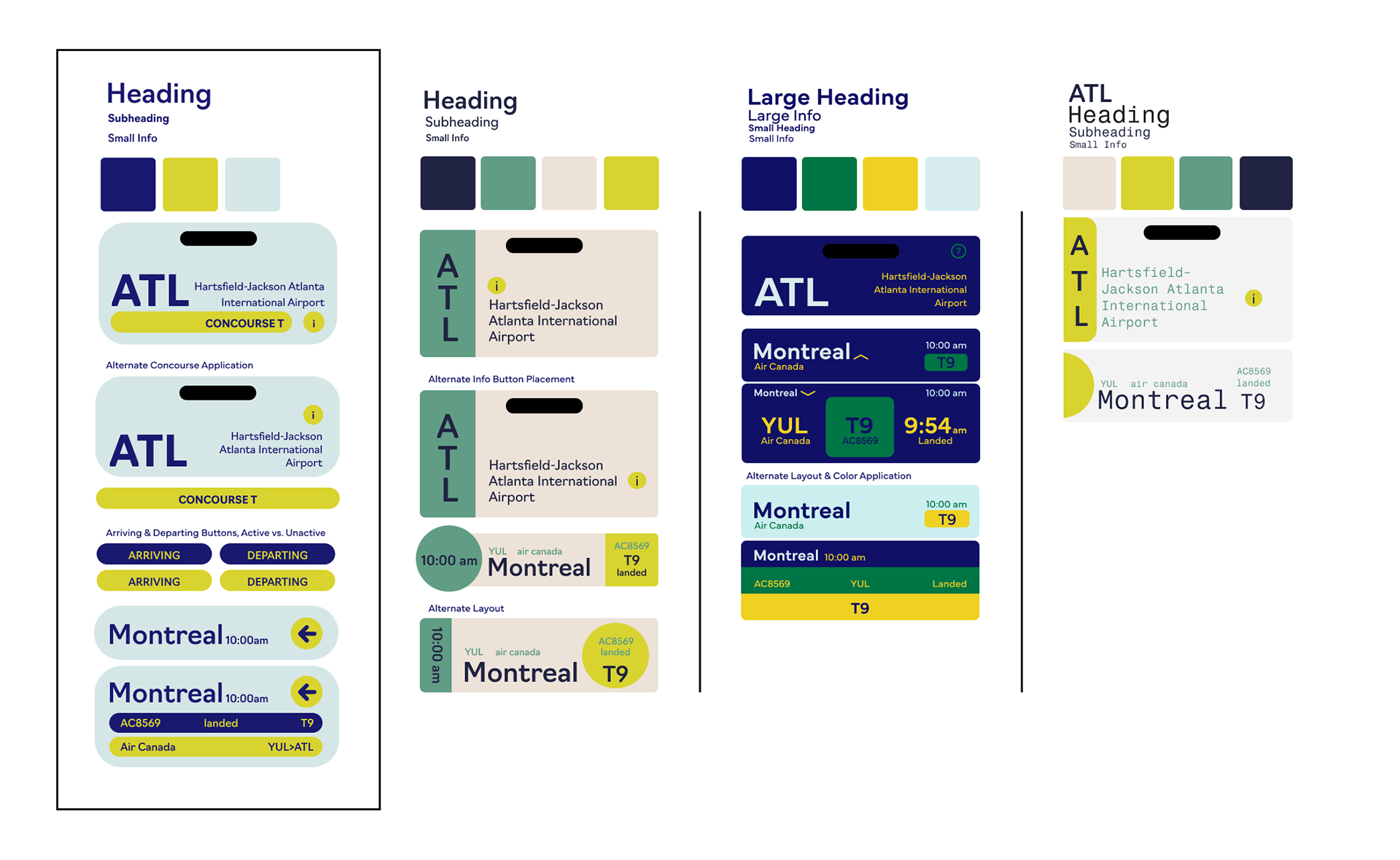 Making use of my predefined typeface and color combo exploration, I made a series of design 'systems', using an outlined concept to create a header element, individual flight info element, and a dropdown menu. I chose to move forward with the system marked 'final decision'.