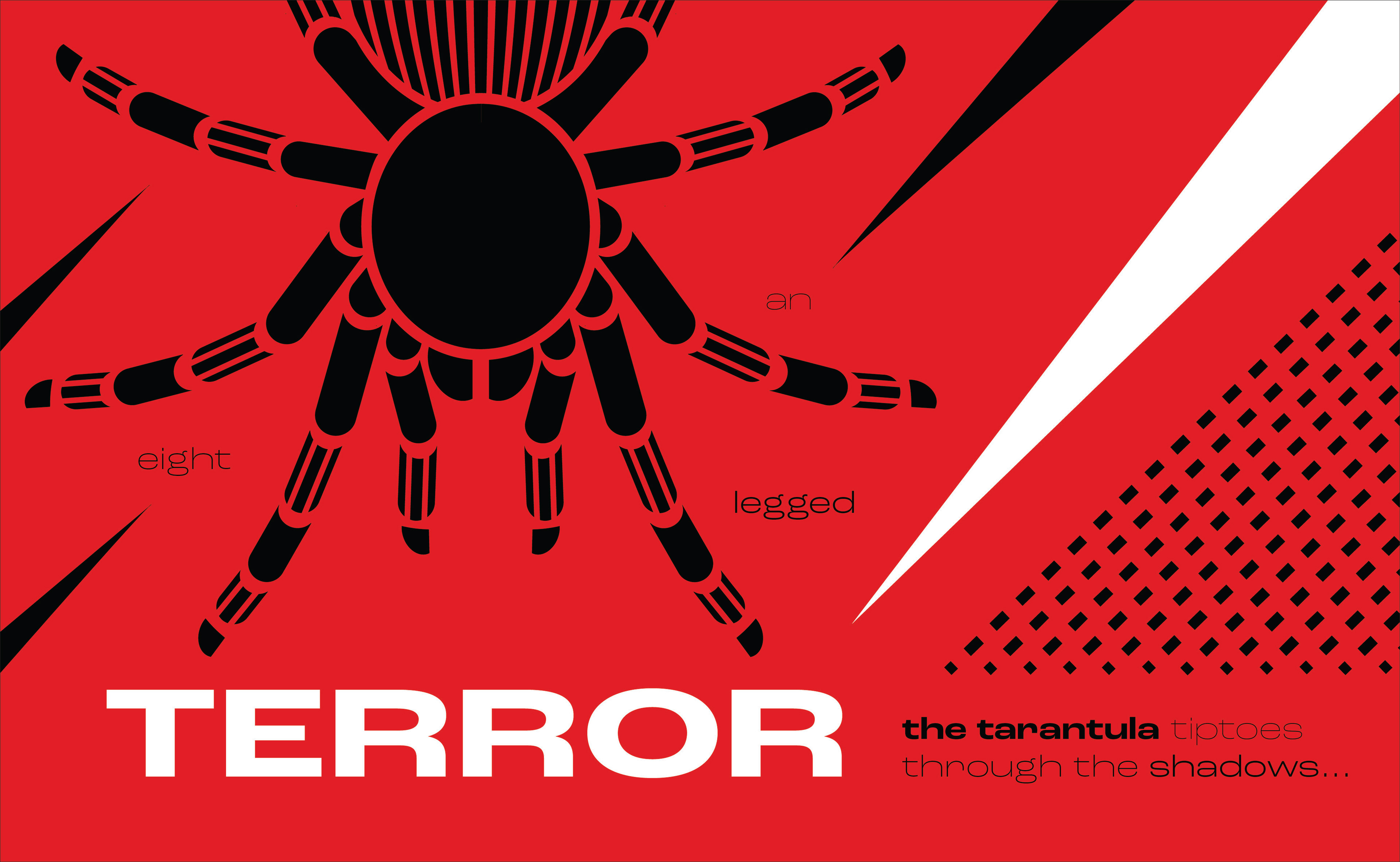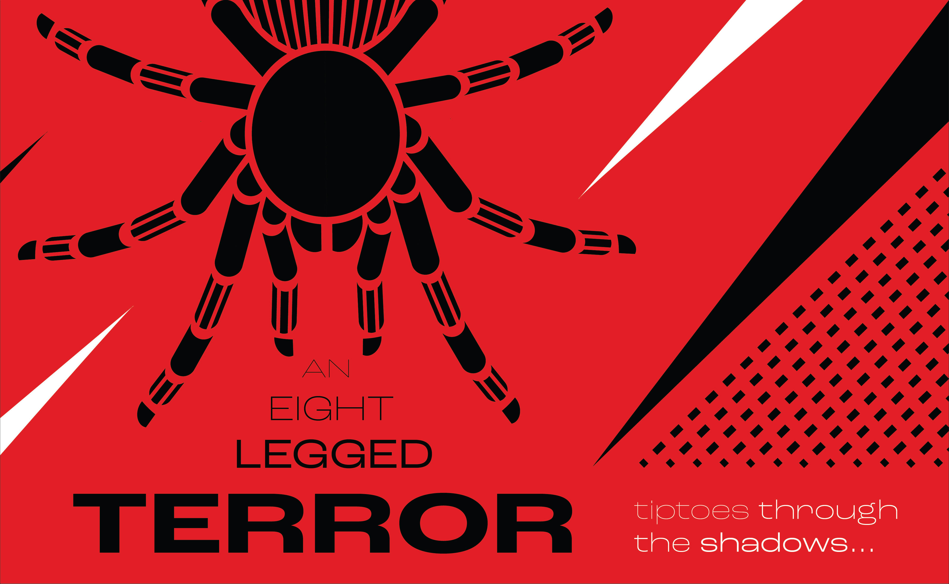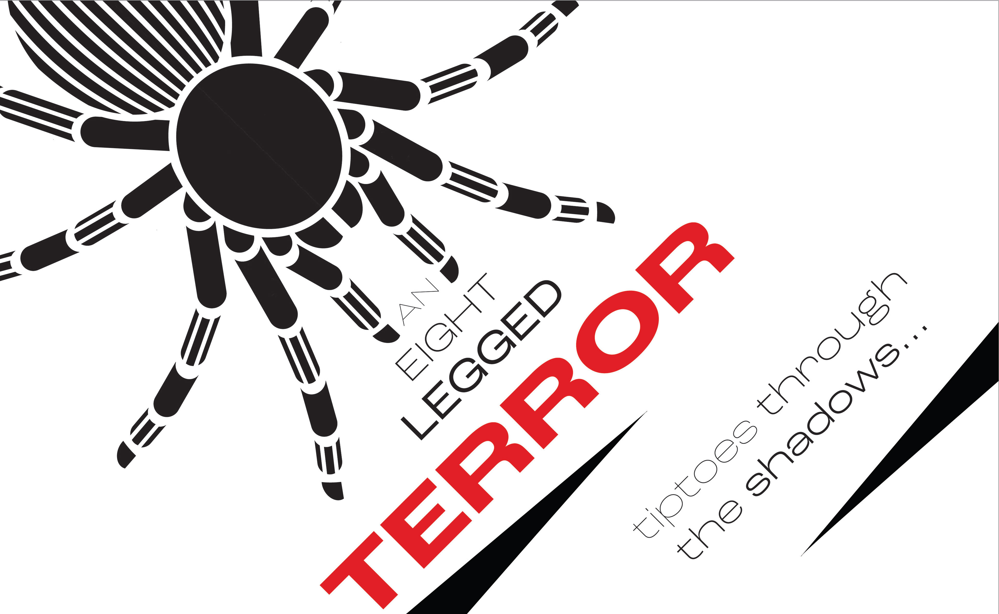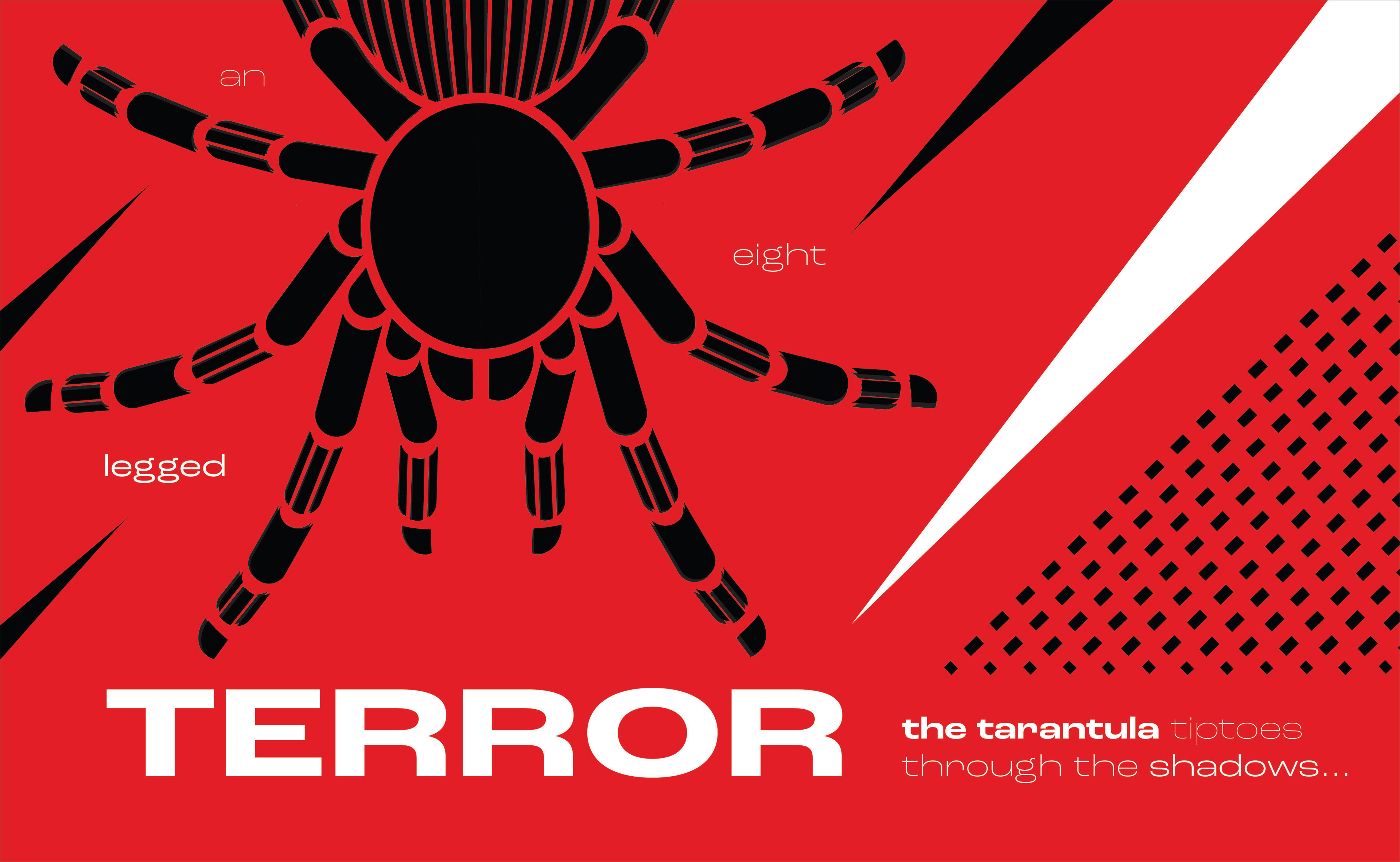 I felt as though there was not enough movement in the way I had arranged the type, so I decided to take the words 'an eight legged' and place them among the legs of the tarantula to emphasize them. I also chose to make 'the tarantula' white to draw more attention to it, and also to link it to 'terror'.