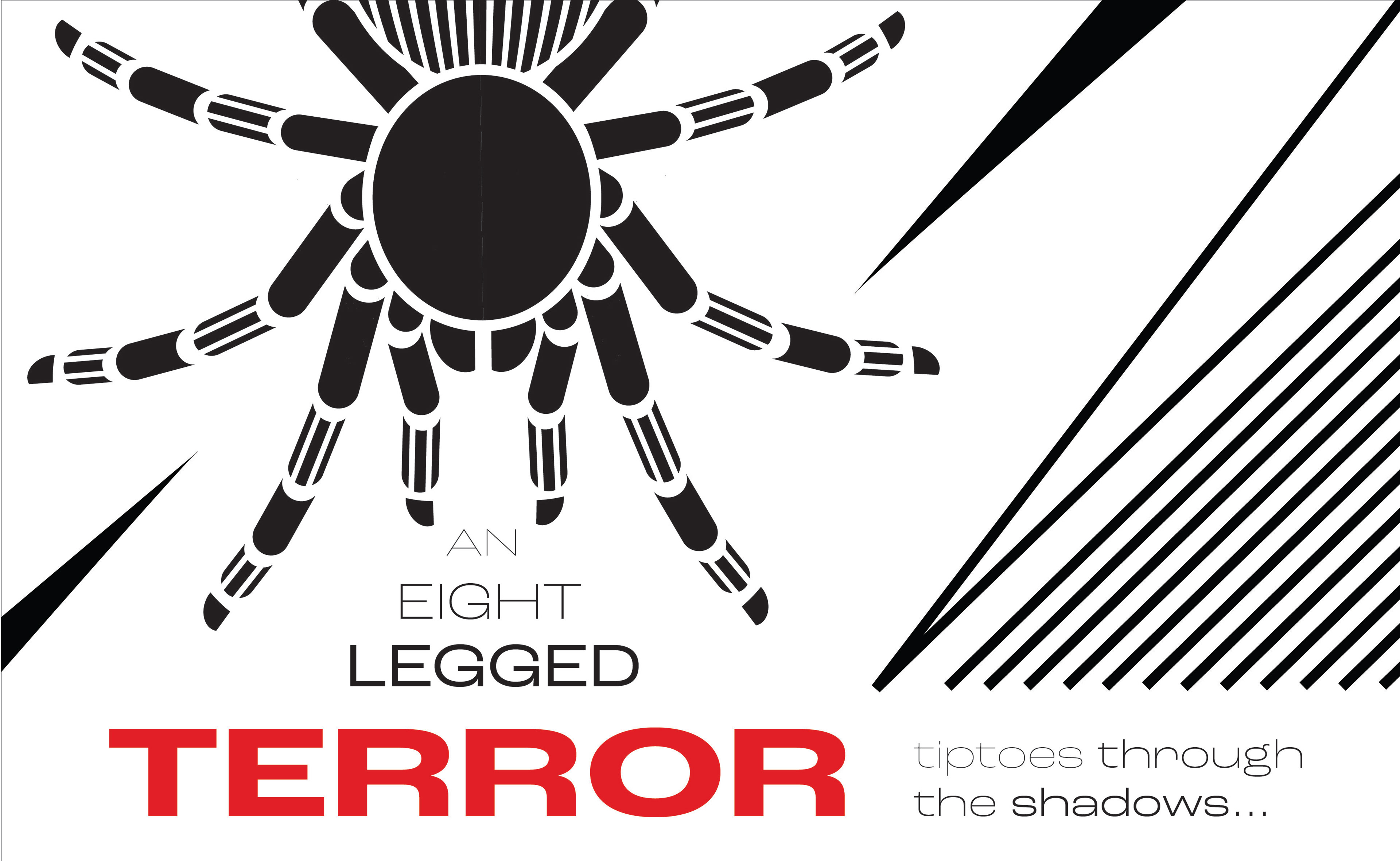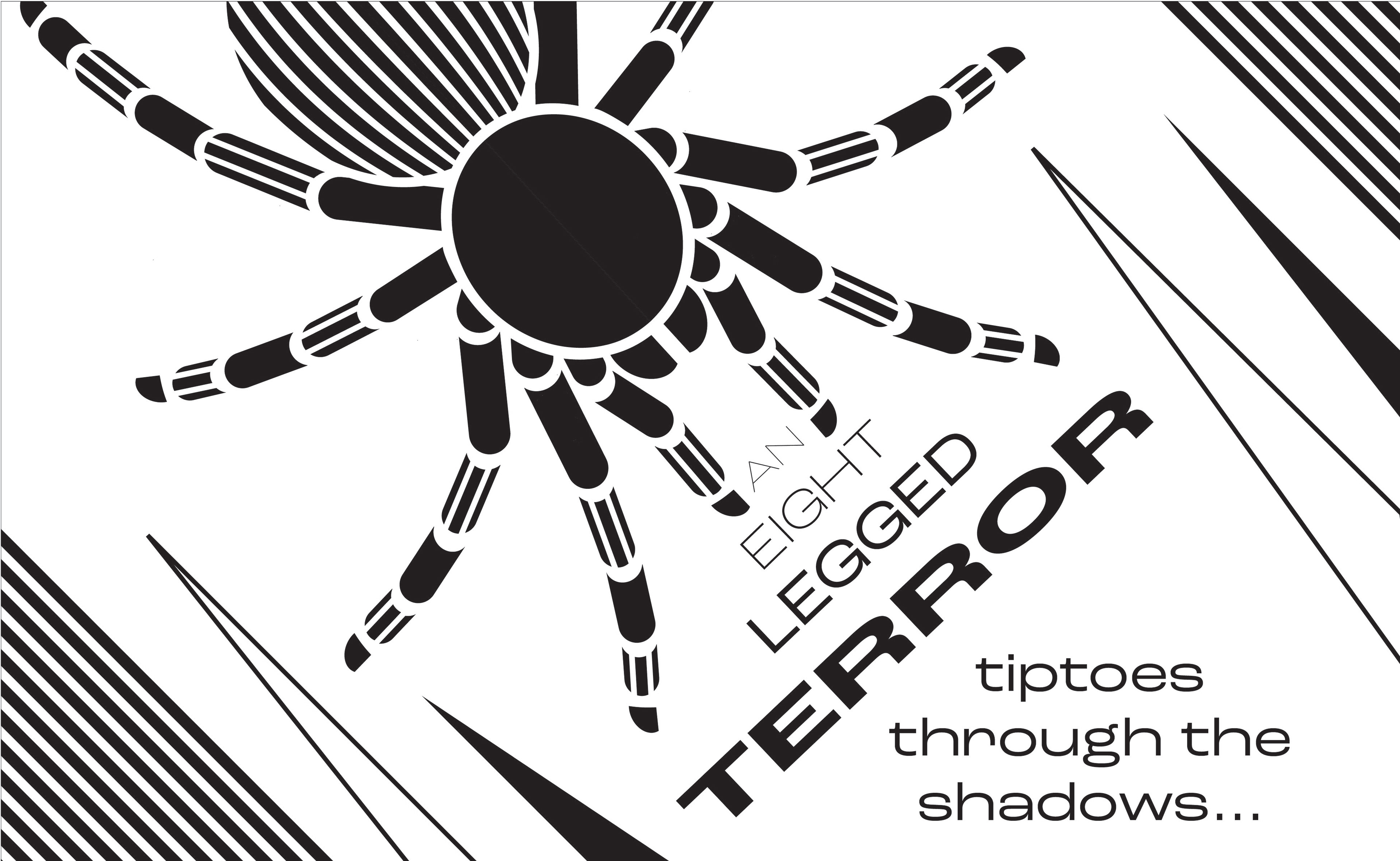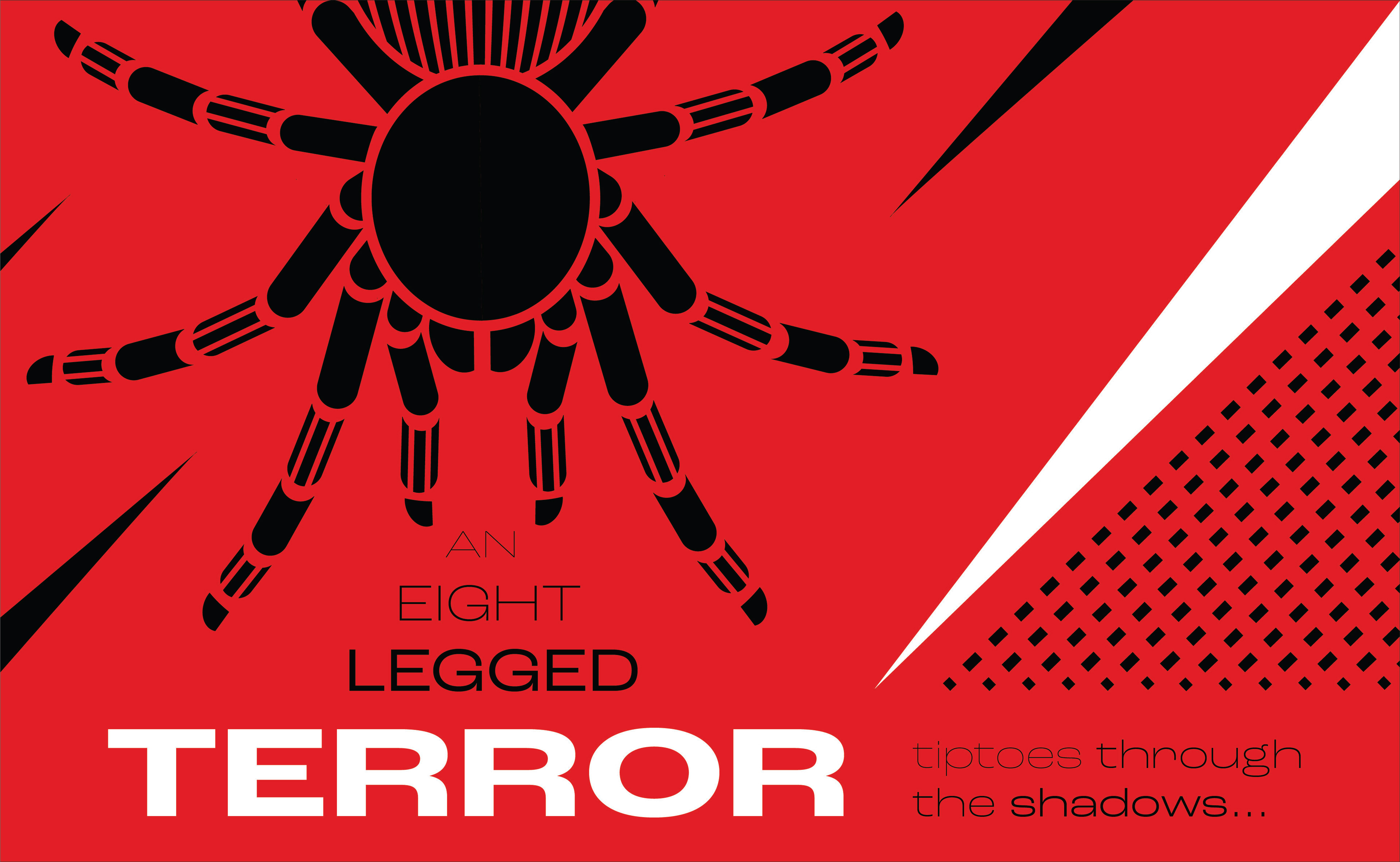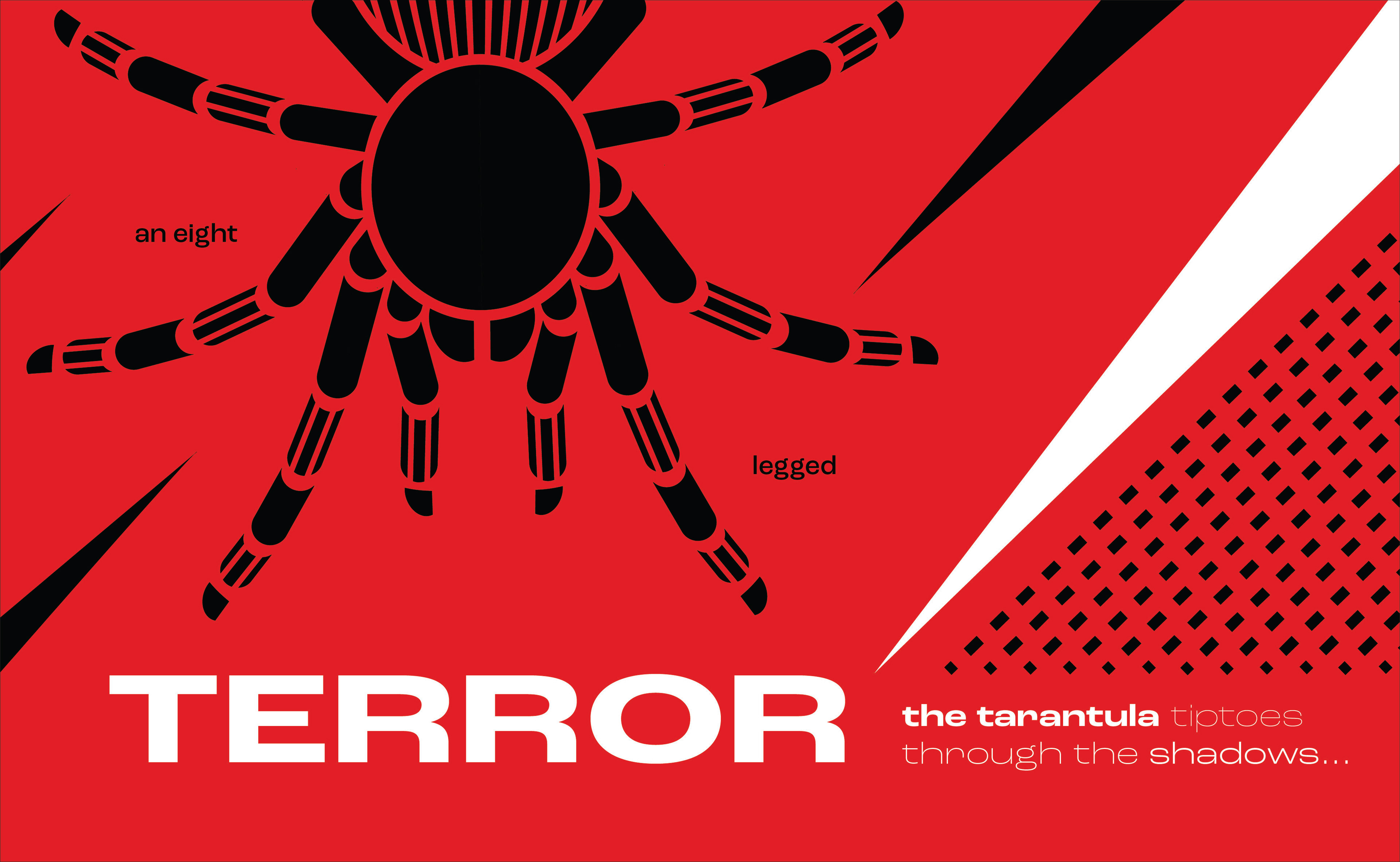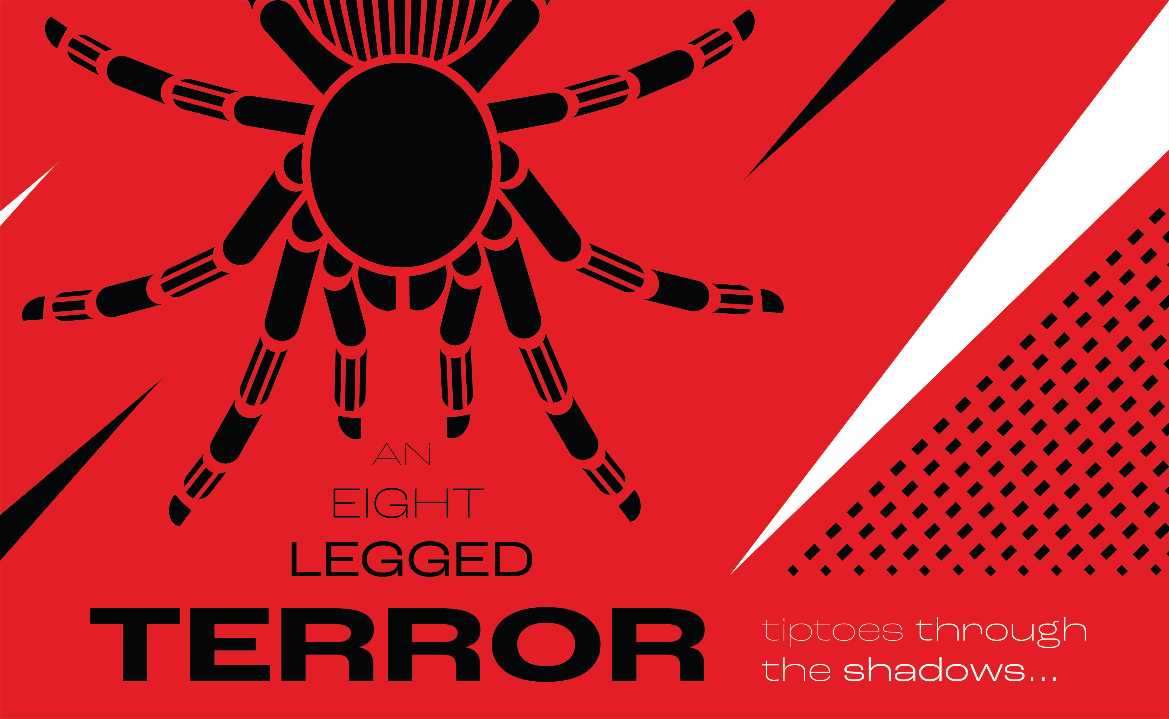 I felt as though there was not enough movement in the way I had arranged the type, so I decided to take the words 'an eight legged' and place them among the legs of the tarantula to emphasize them. I also chose to make 'the tarantula' white to draw more attention to it, and also to link it to 'terror'.
