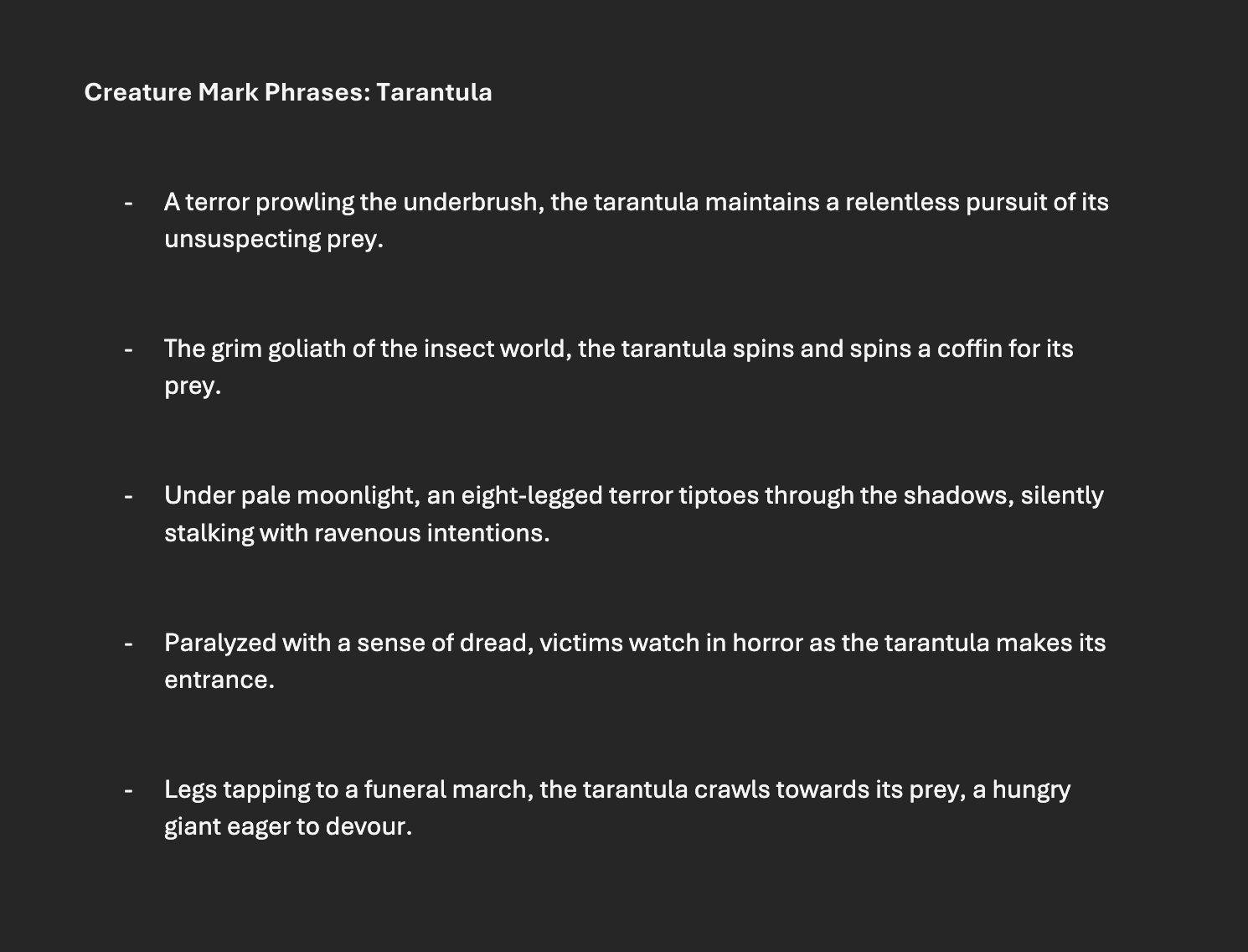 For this project, I created the interpretive phrase in collaboration with my classmate, Ben Solinski. He composed five poetic phrases about the tarantula, and I chose to move forward with a shortened version of the third one on the list. I added the tarantula's name into the phrase for ease of communication, and resulted with 'an eight legged terror tiptoes through the shadows'. I would later a 'the tarantula' to the phrase for clarity.