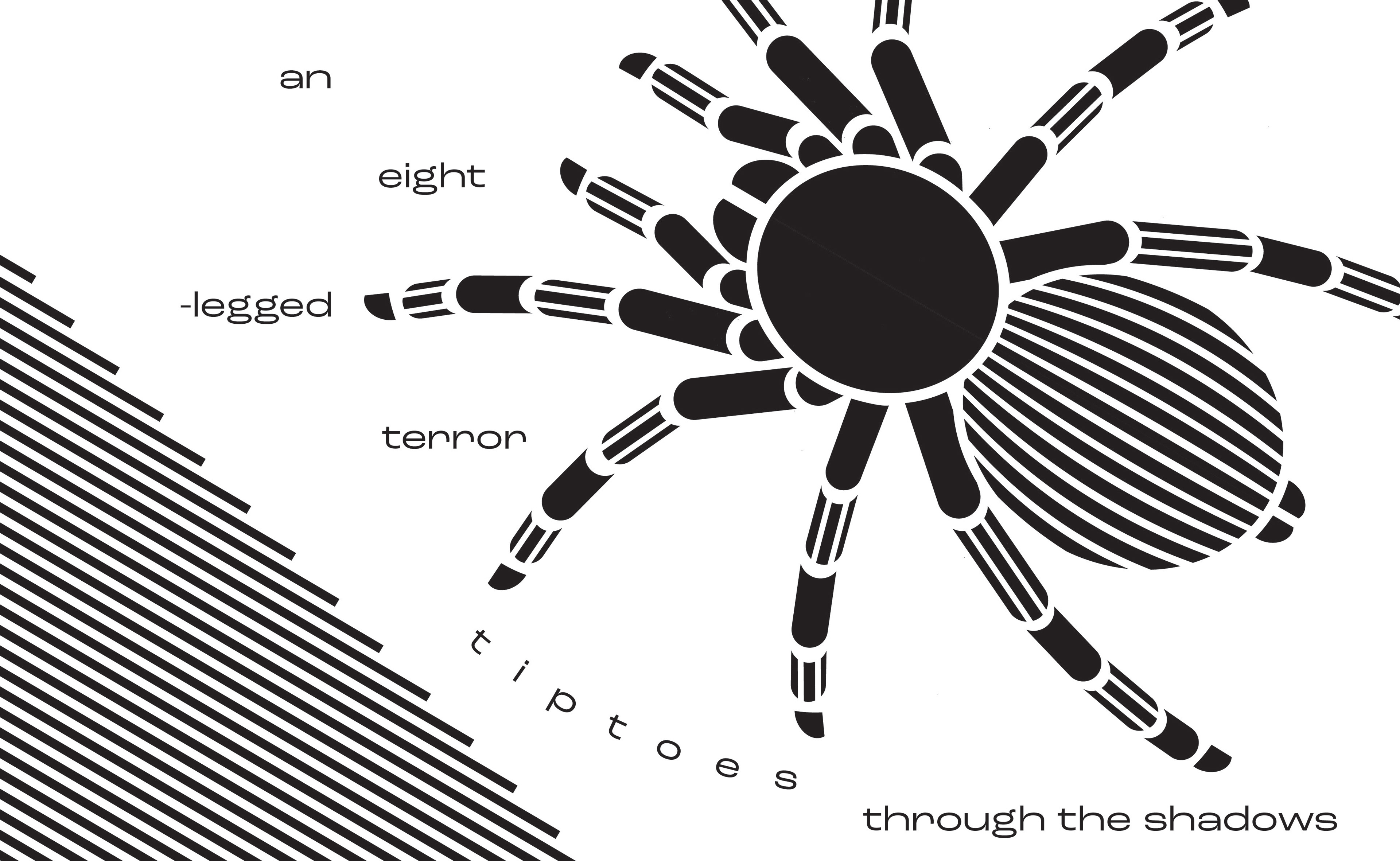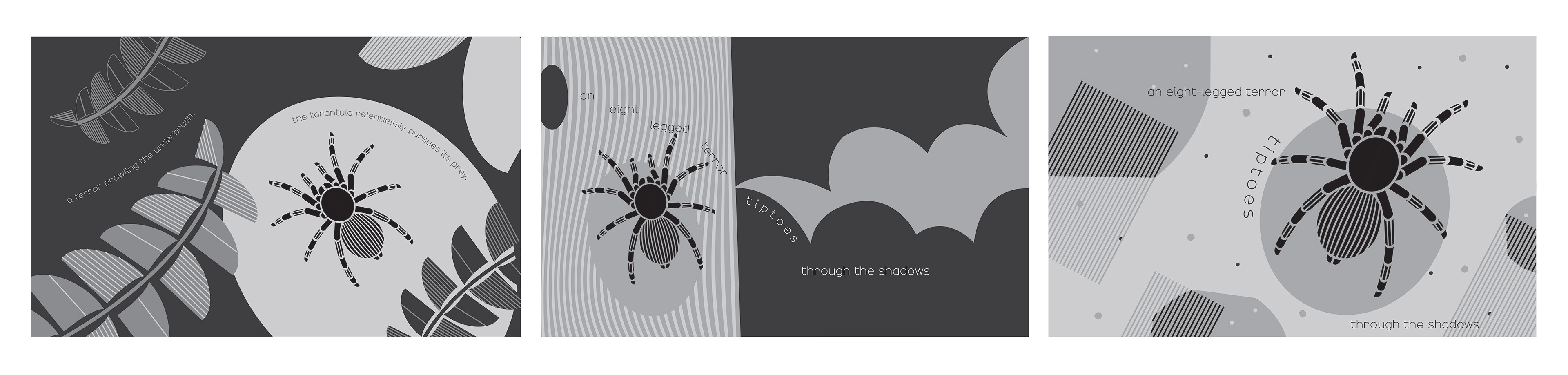 In my reworkings, I used lines as well as triangular forms to imply the 'shadows', and chose to move forward with the bottom right iteration, because having the tarantula diagonal felt like it was running across the page, while having it vertically static felt more as though it was tiptoeing.