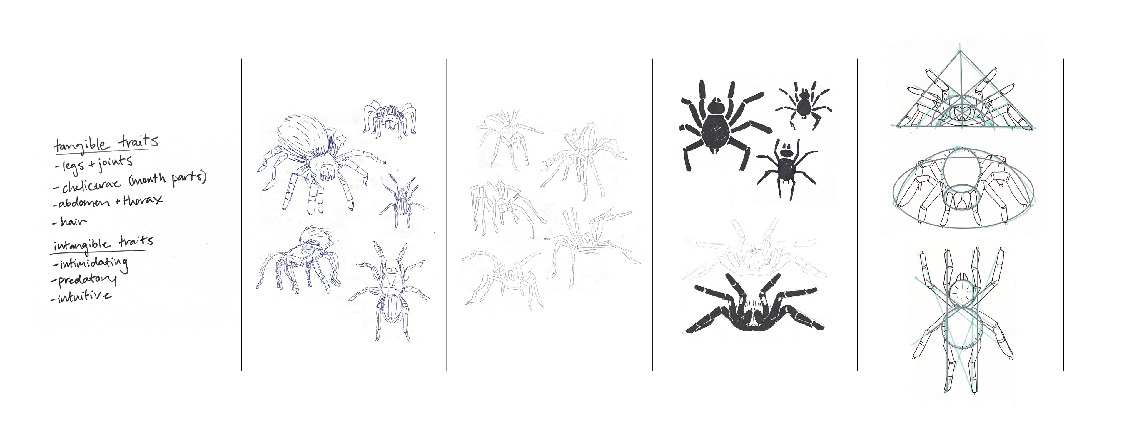 Moving forward with the first two poses, I made ideations on several aspects of the tarantula. As previously stated, it was during this phase that I decided that my final product would depict the tarantula from the top view, as I believed it was the most effective display of the tarantula's features.